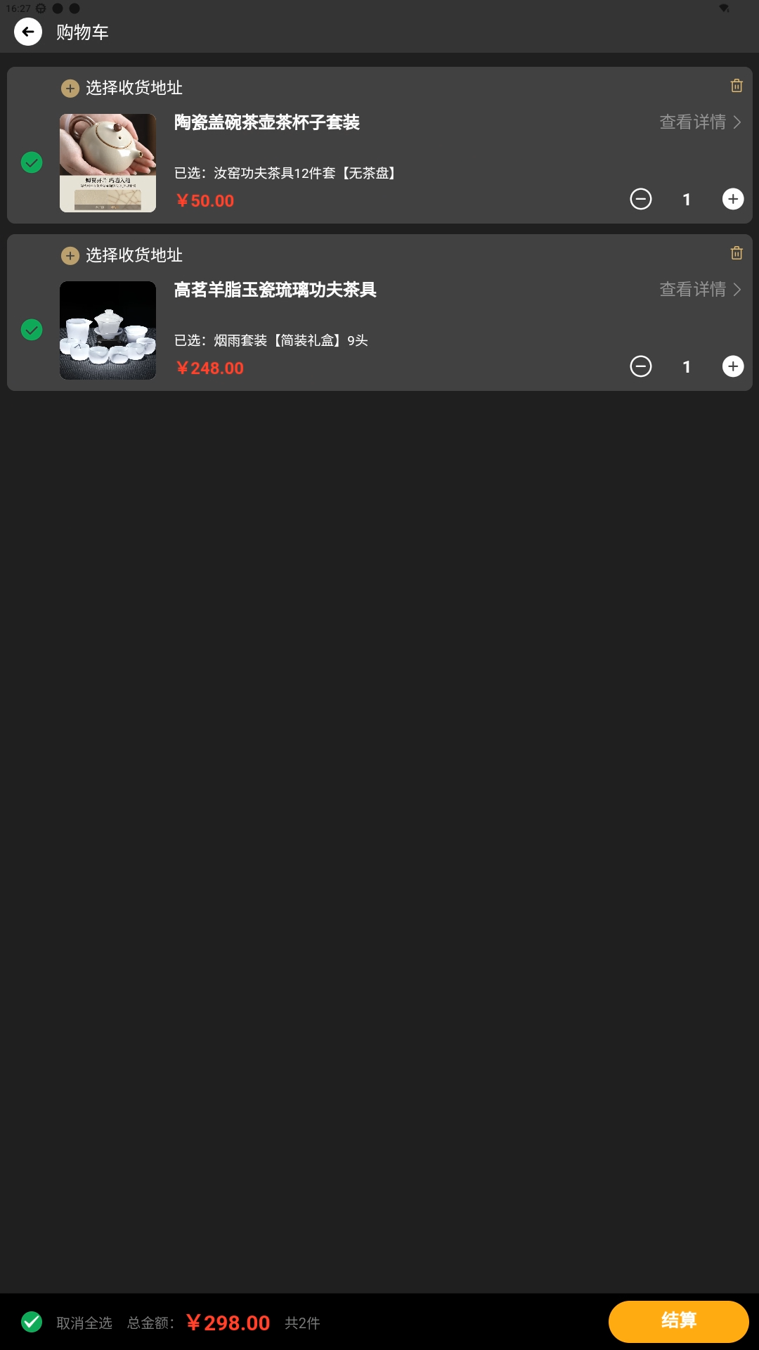 点击购物车即可进入购物车界面,显示添加至购物车的商品,商品价格,结算栏。