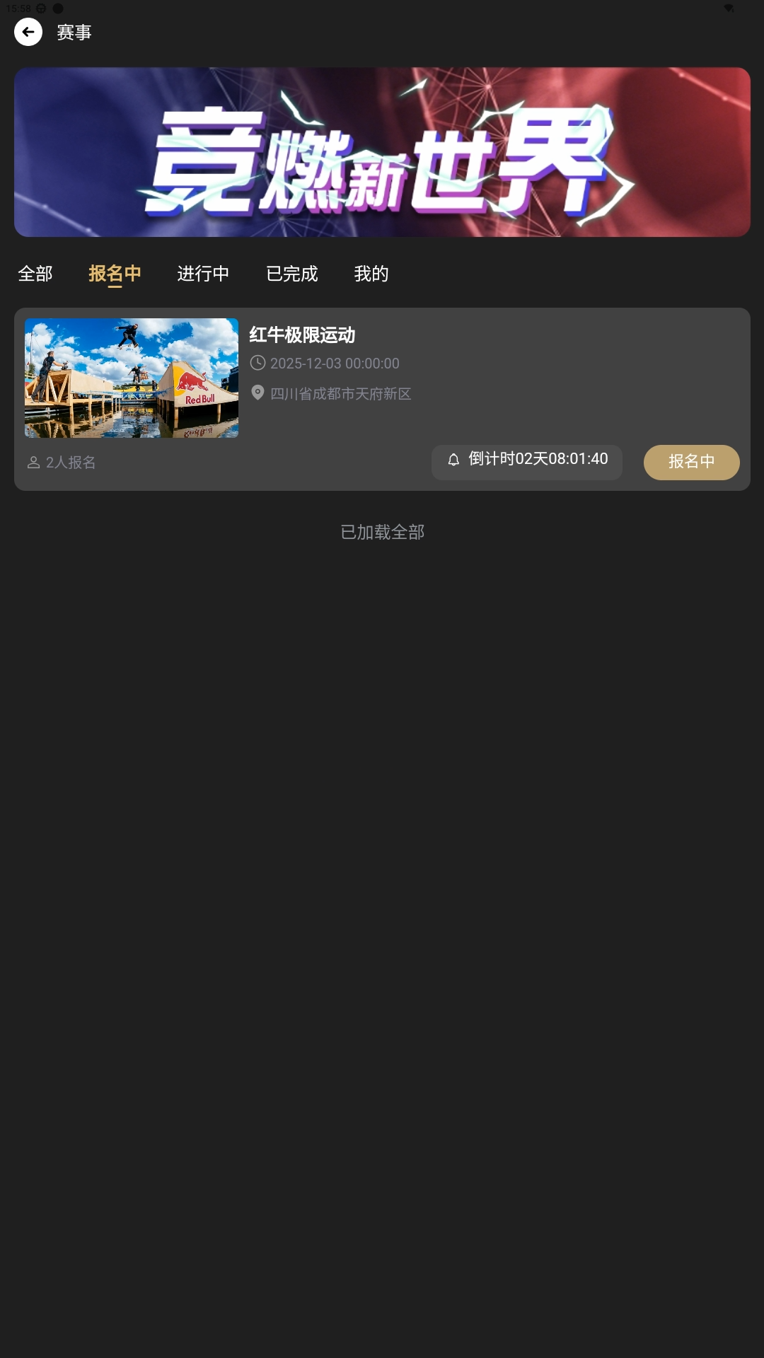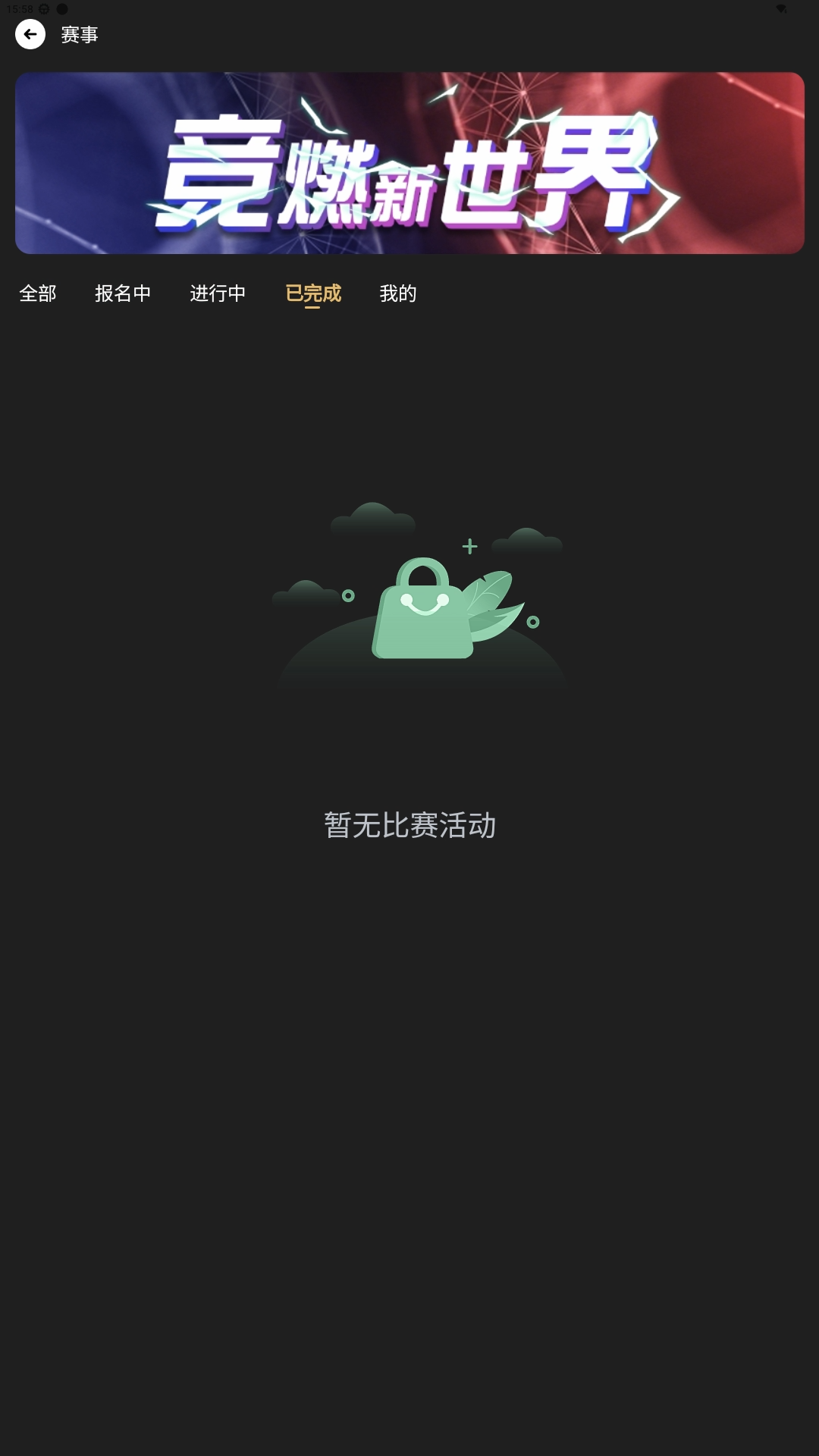 进度分类:全部,报名中,进行中,已完成,我的,如未有比赛,提示【暂无比赛活动】。