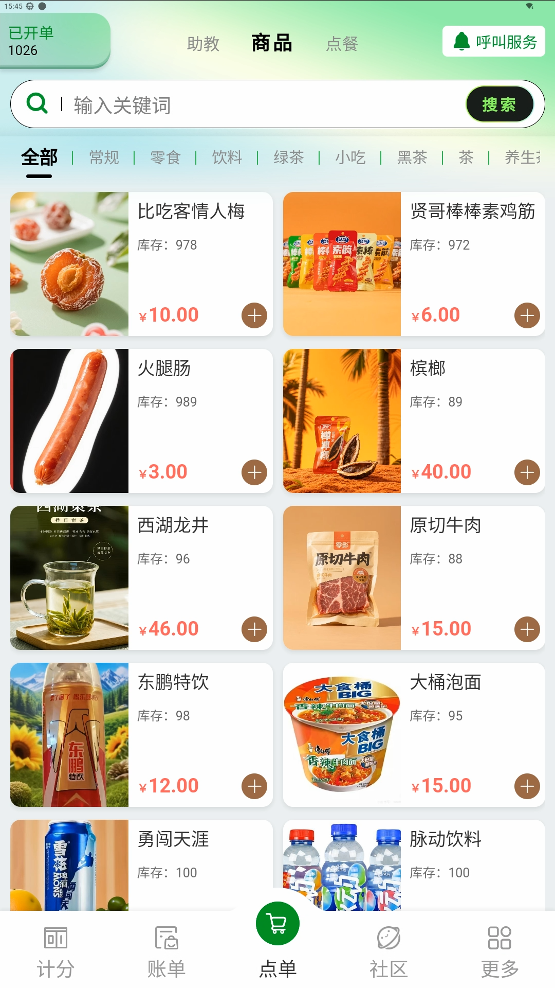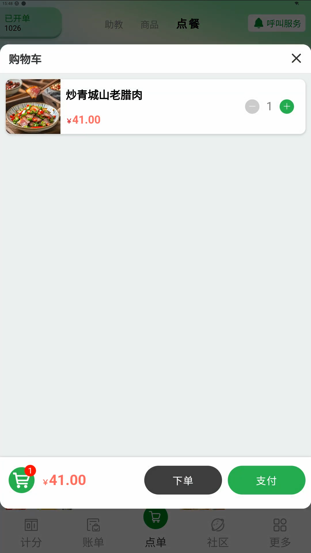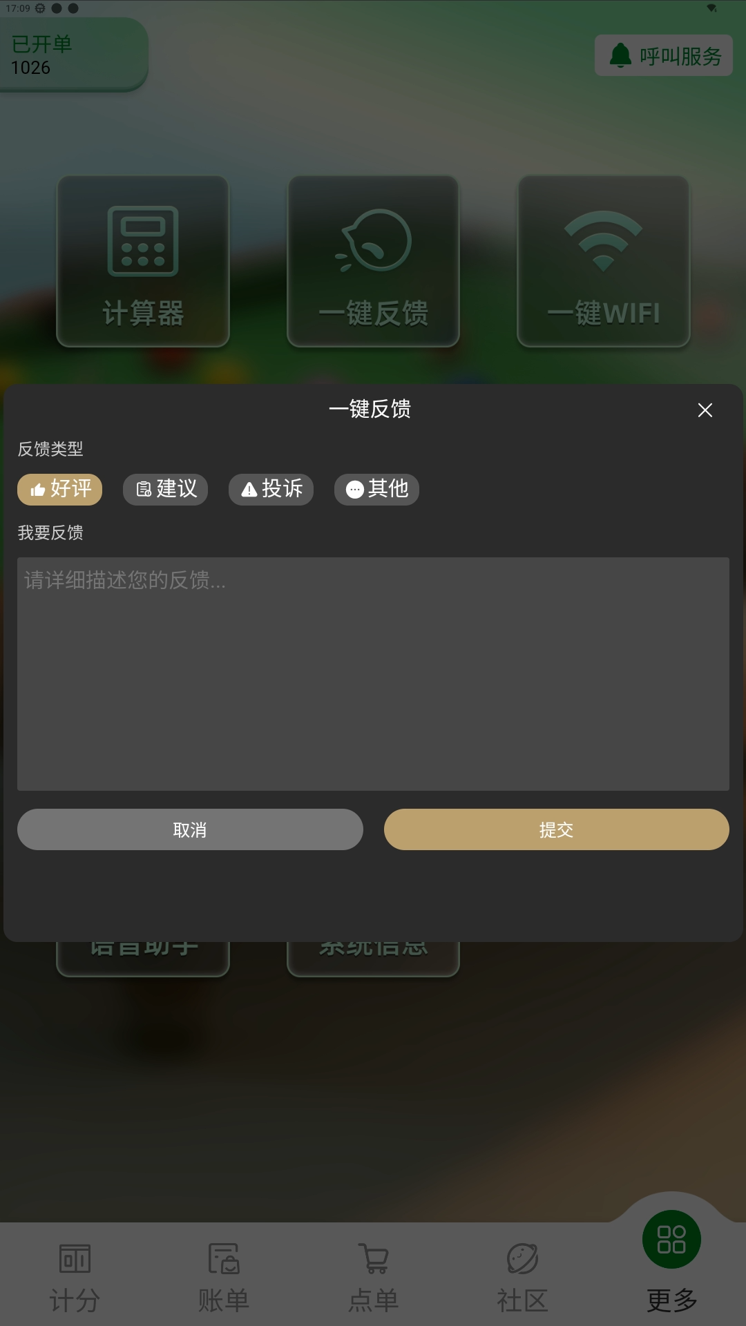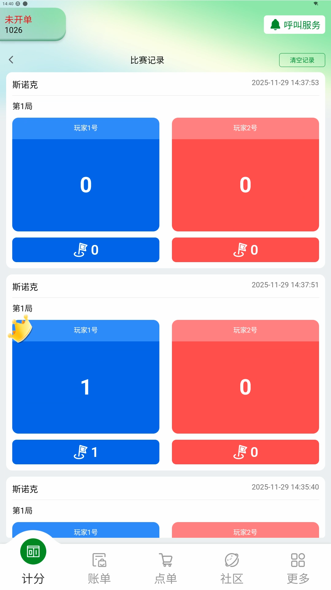 软件主要有计分、账单、点单、社区以及更多五大功能板块。