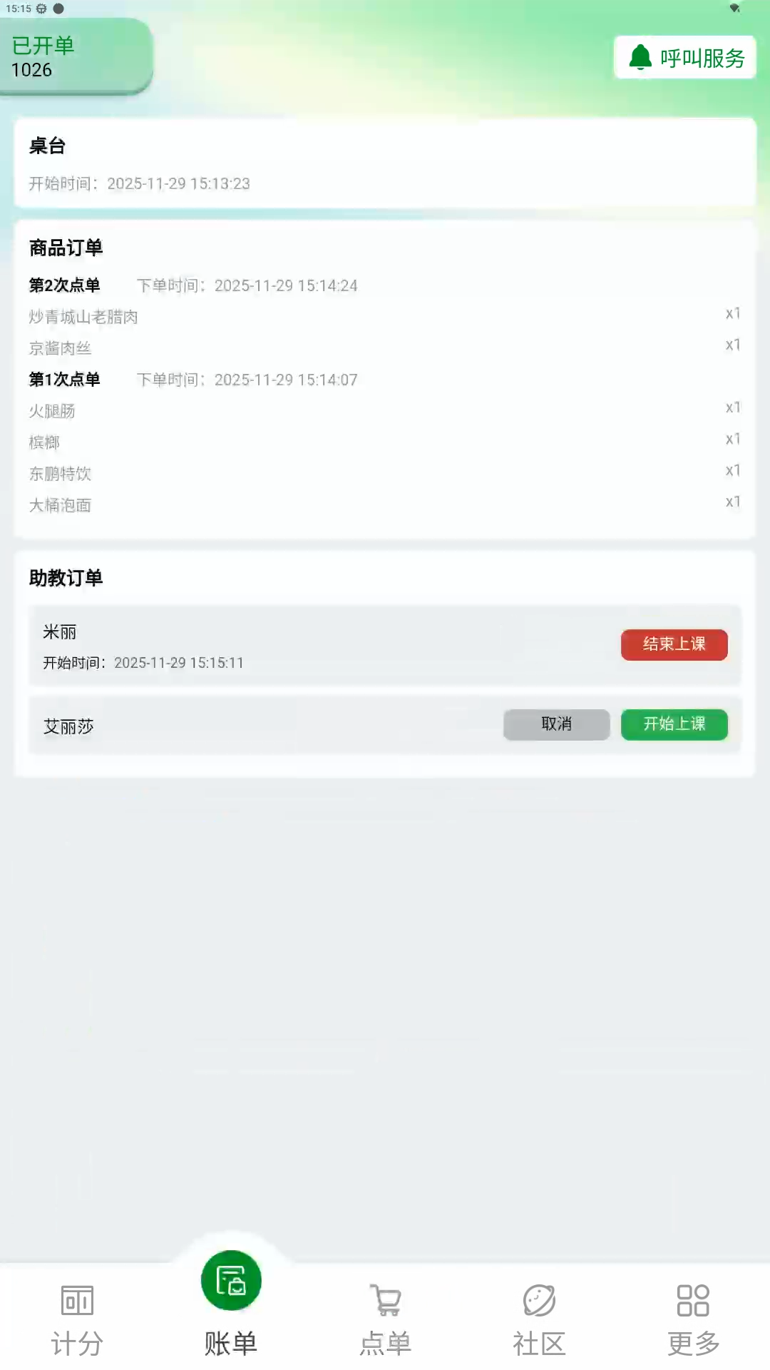 可以查看当前桌台的所有消费信息,包含了所有的商品以及所有的助教信息。并且助教在此界面可以确定开始/结束上课。