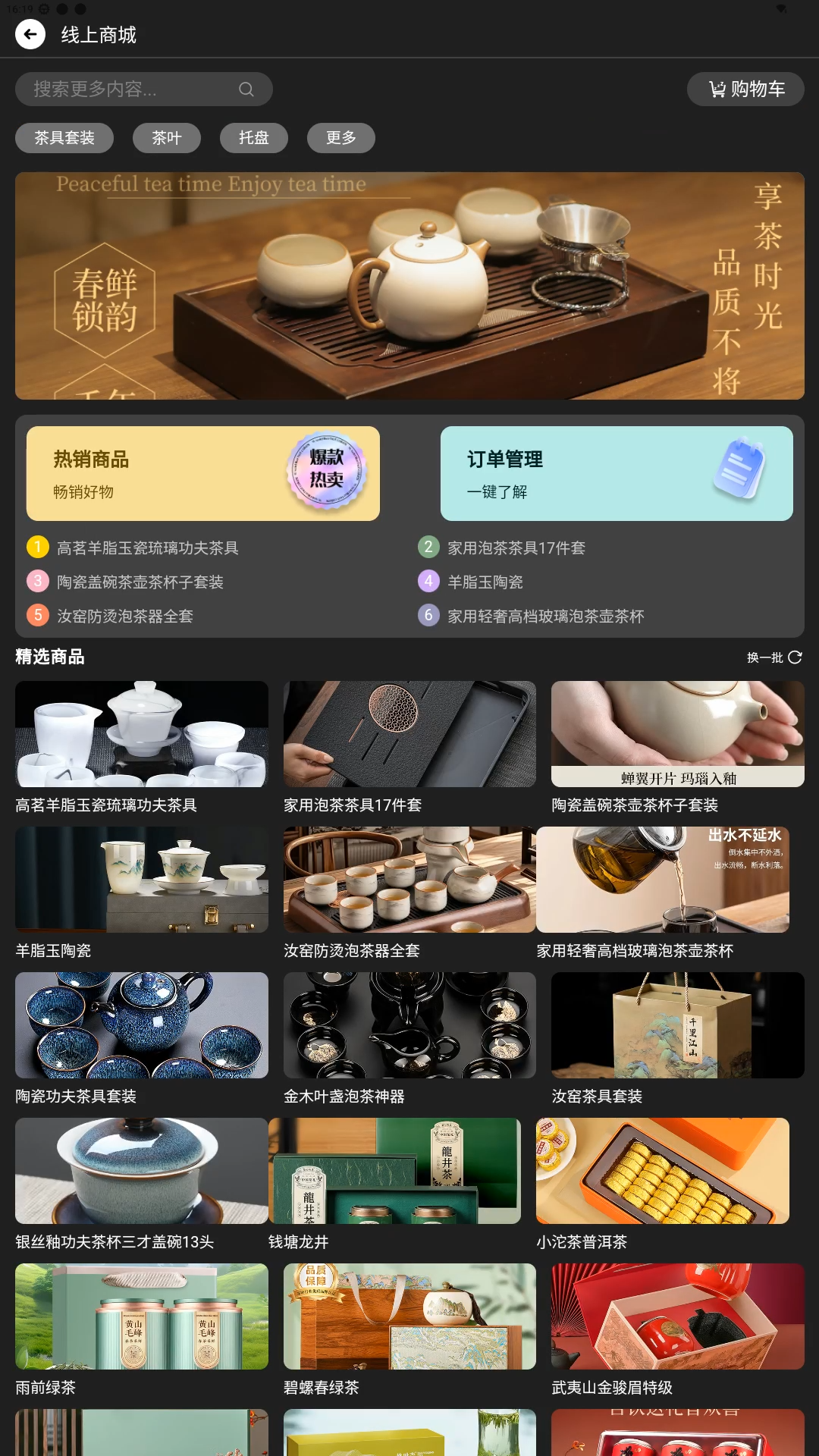 屏幕中间为分类筛选栏,海报,热销商品按钮,订单管理按钮,商品排行。