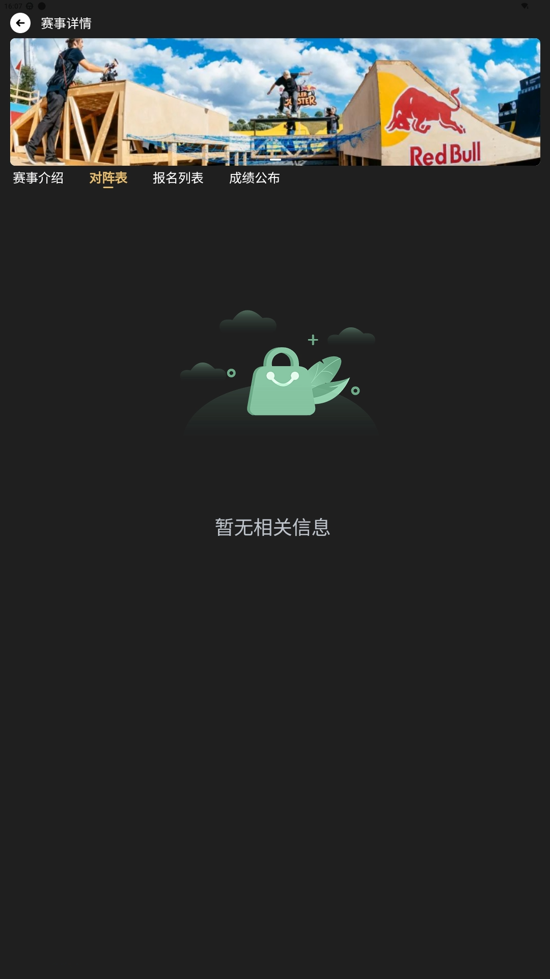 赛事详情界面:赛事详情界面分为赛事介绍,对阵表、报名列表,成绩公布。