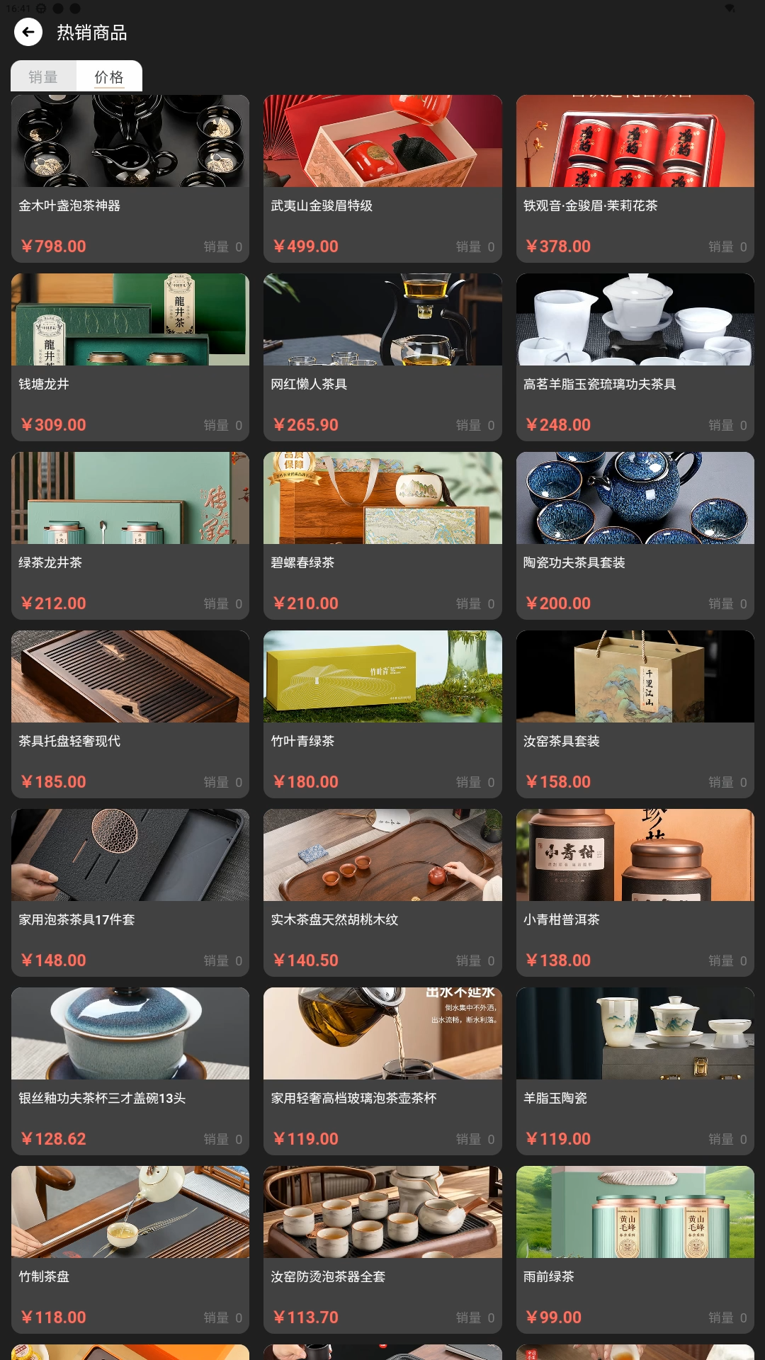 热销商品按钮:点击跳转热销商品界面,界面根据销量,价格分类按钮,进行分类展示商品,点击商品进入商品详情页面。