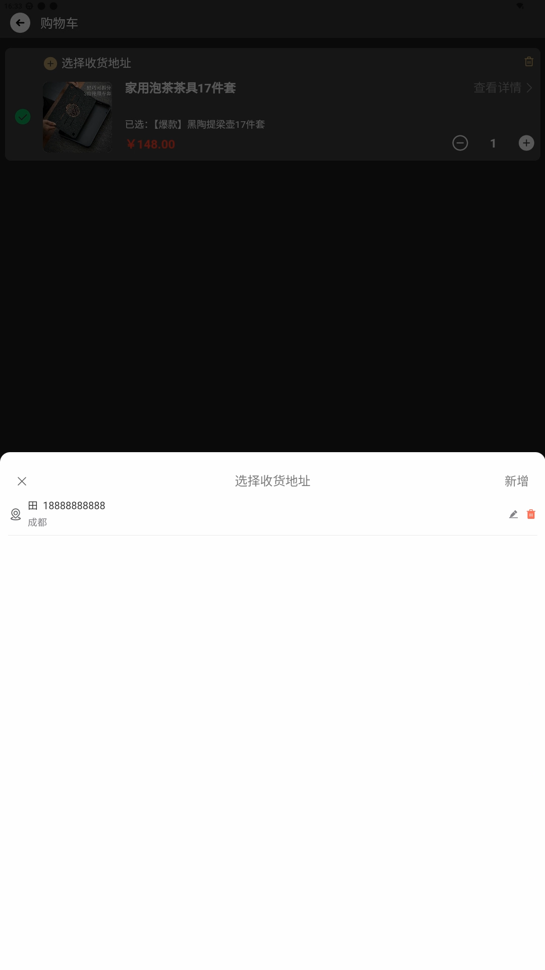 - 选择收货地址按钮:初始不显示位置,需手动输入收货地址,点击即可进入收货地址界面,添加新增按钮,进入新增地址界面,输入地址内容,点击保存,均可保存地址,地址显示在收货地址界面,点击即可选中该地址为收货地址(也可编辑,删除地址)。