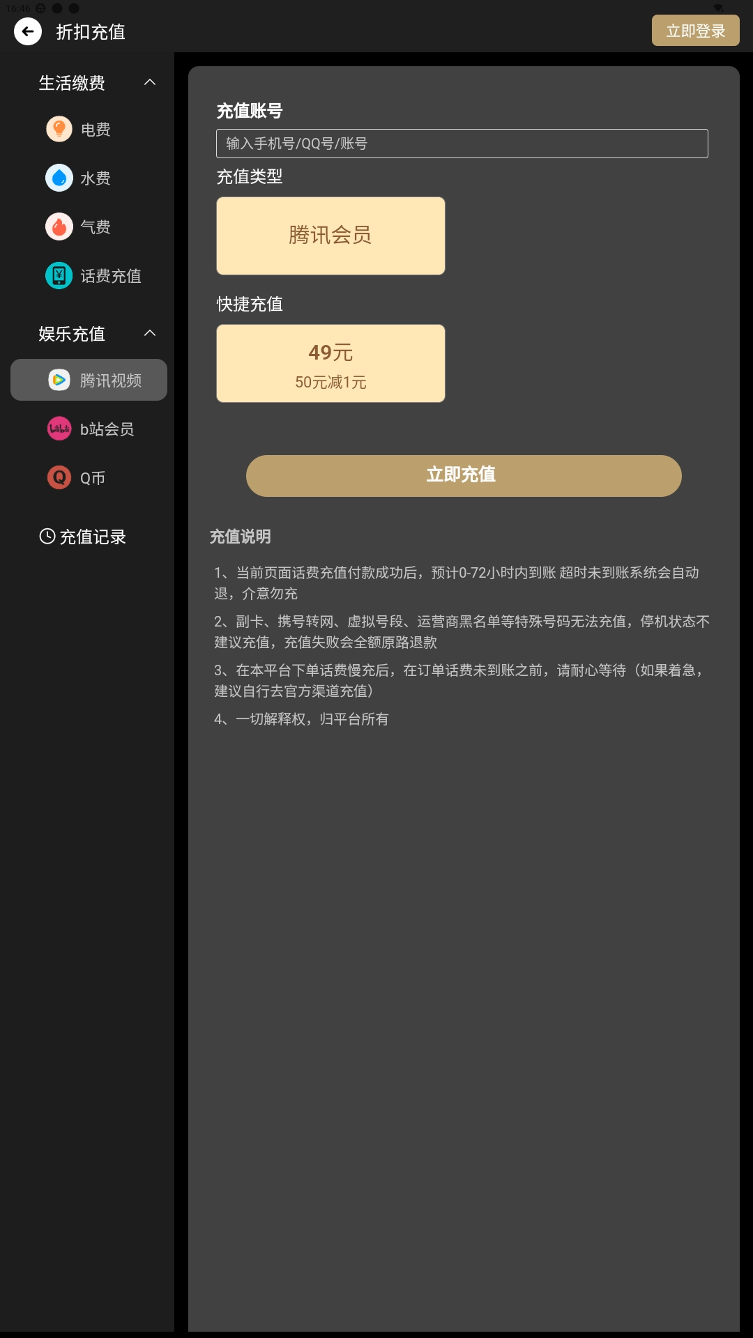 折扣充值:点击折扣充值按钮,进入折扣充值界面,根据充值的类型不同,左侧的充值界面也会随之变化,界面弹出提示弹窗。