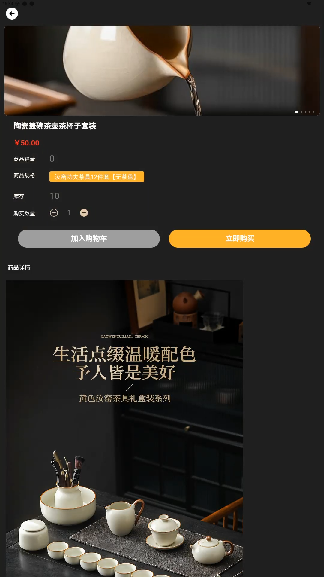 查看详情:点击即可跳转商品详情页面,展示商品的,图片,名字,价格,商品销量,商品规格,库存,购买数量按钮,加入购物车按钮,立即购买按钮,商品详情展示区域。